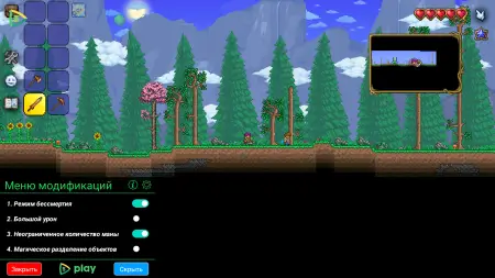 Terraria (MOD: бессмертие, мод меню) — Это полная версия Террария со встроенным меню, где можно включить неуязвимость, неограниченную ману и возможность получить все предметы путем их разделения.